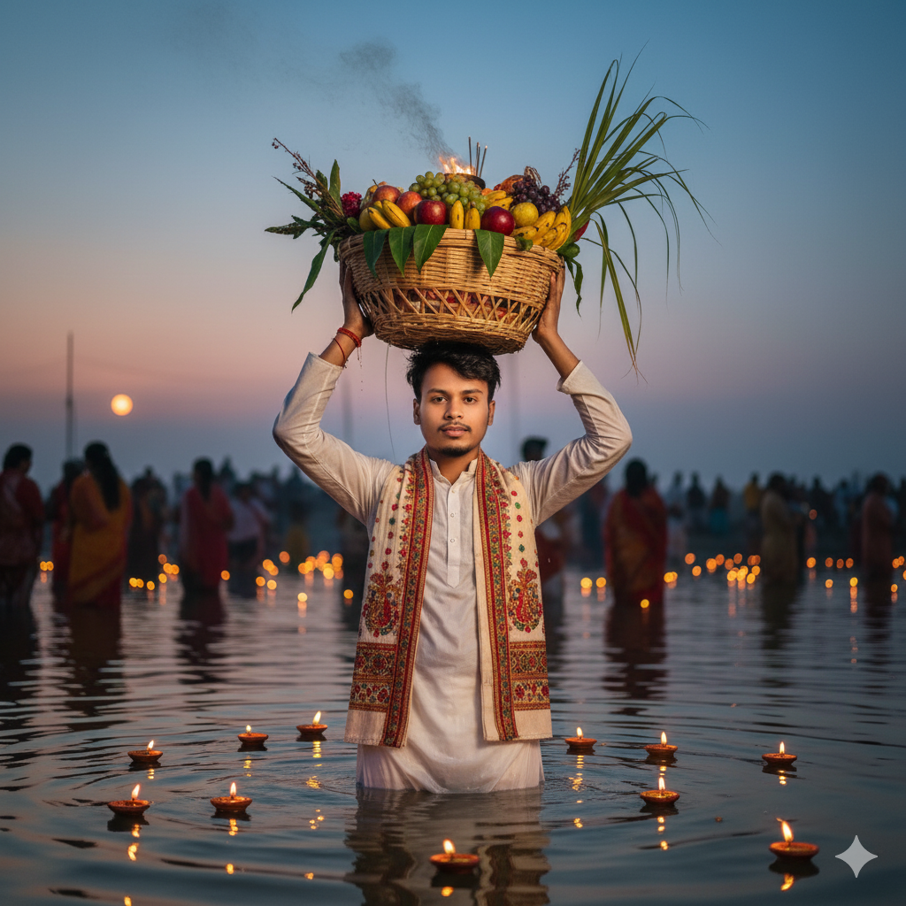 Create candid photoshoot of young Indian man (same as uploaded photo and don’t change hairstyle and facial expressions) stands waist-deep in water, centered in the frame, facing the viewer. He is dressed in a traditional white kurta and a decorative embroidered scarf. holding a woven basket above his head filled with fruits and greenery, possibly sugarcane. Smoke rises from the basket. Floating candles illuminate the water around him. Behind him, a crowd of people, performing chhath pooja