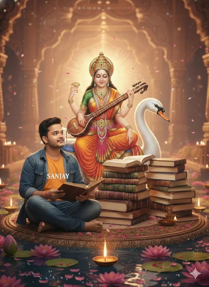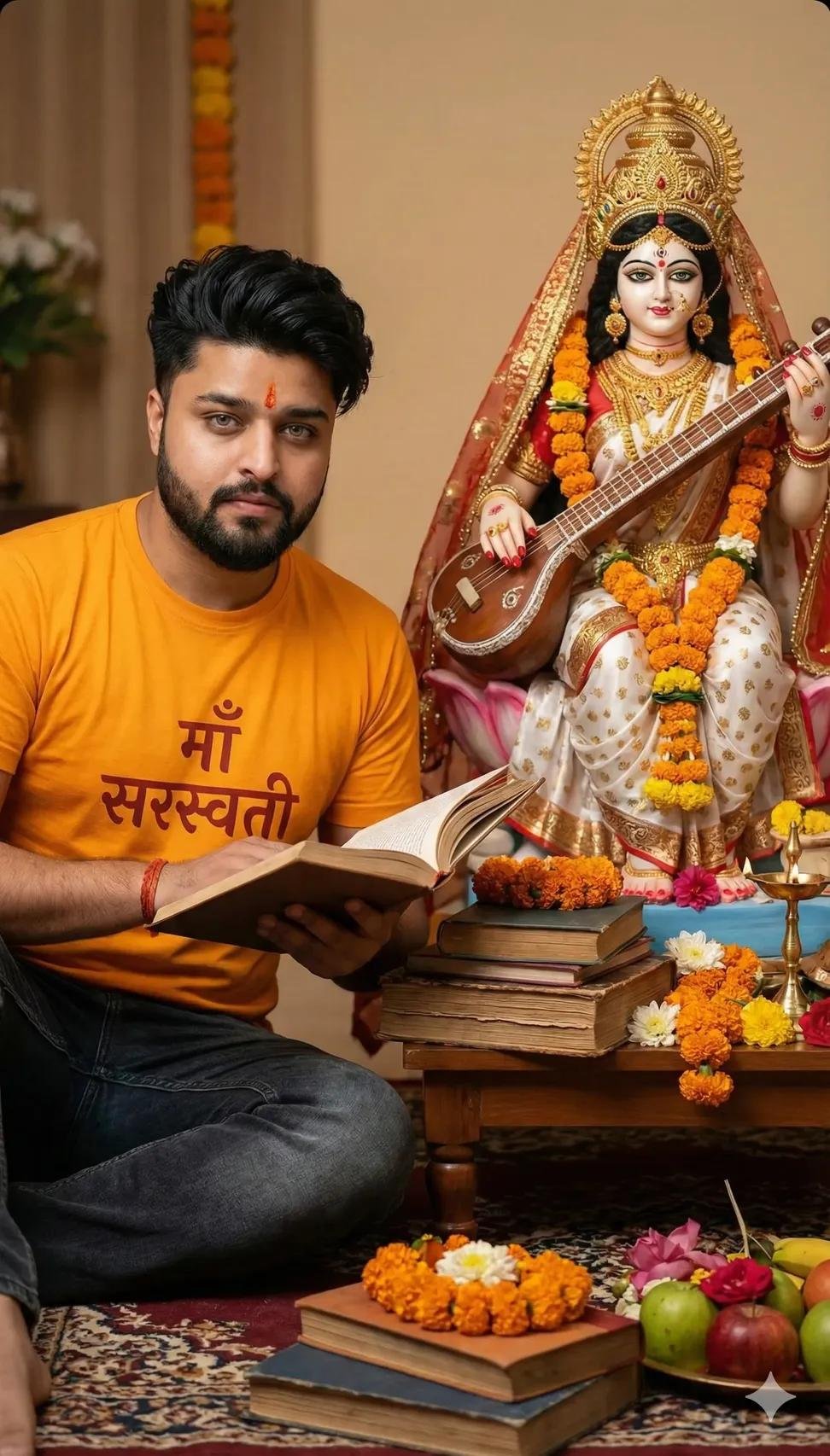 A There mother Sarswati with a vina in his hand be and many books next to it. A 23 years old boy sitting in left side the name “maa Saraswati ” written on his saffron t-shirt and cort jeans good loking and holding a book in hand. Images realistic image.100% same face and hair Saraswati mein pure singar aur copy kitabe Rakhi hue phool aur sab kuchh .