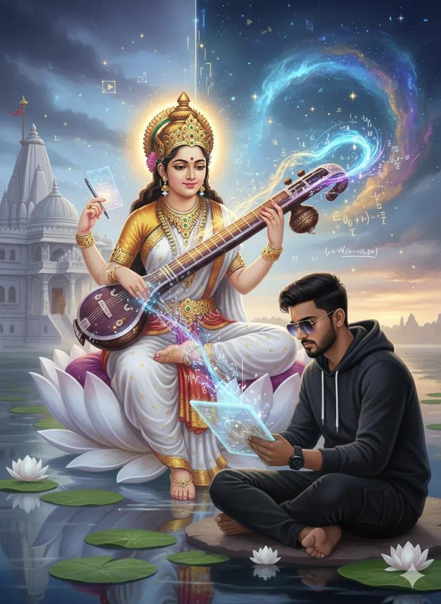A breathtakingly beautiful, hyper-realistic digital painting of Maa Saraswati seated gracefully on a white lotus, playing a luminous Veena that emits glowing digital sound waves and mathematical equations. She is holding digital versions of the Vedas and a futuristic digital pen. The Indian man (you) is shown sitting nearby, focused on a glowing digital slate, receiving the knowledge stream. The background is a serene fusion of a pristine white temple and a calm, abstract digital sky filled with