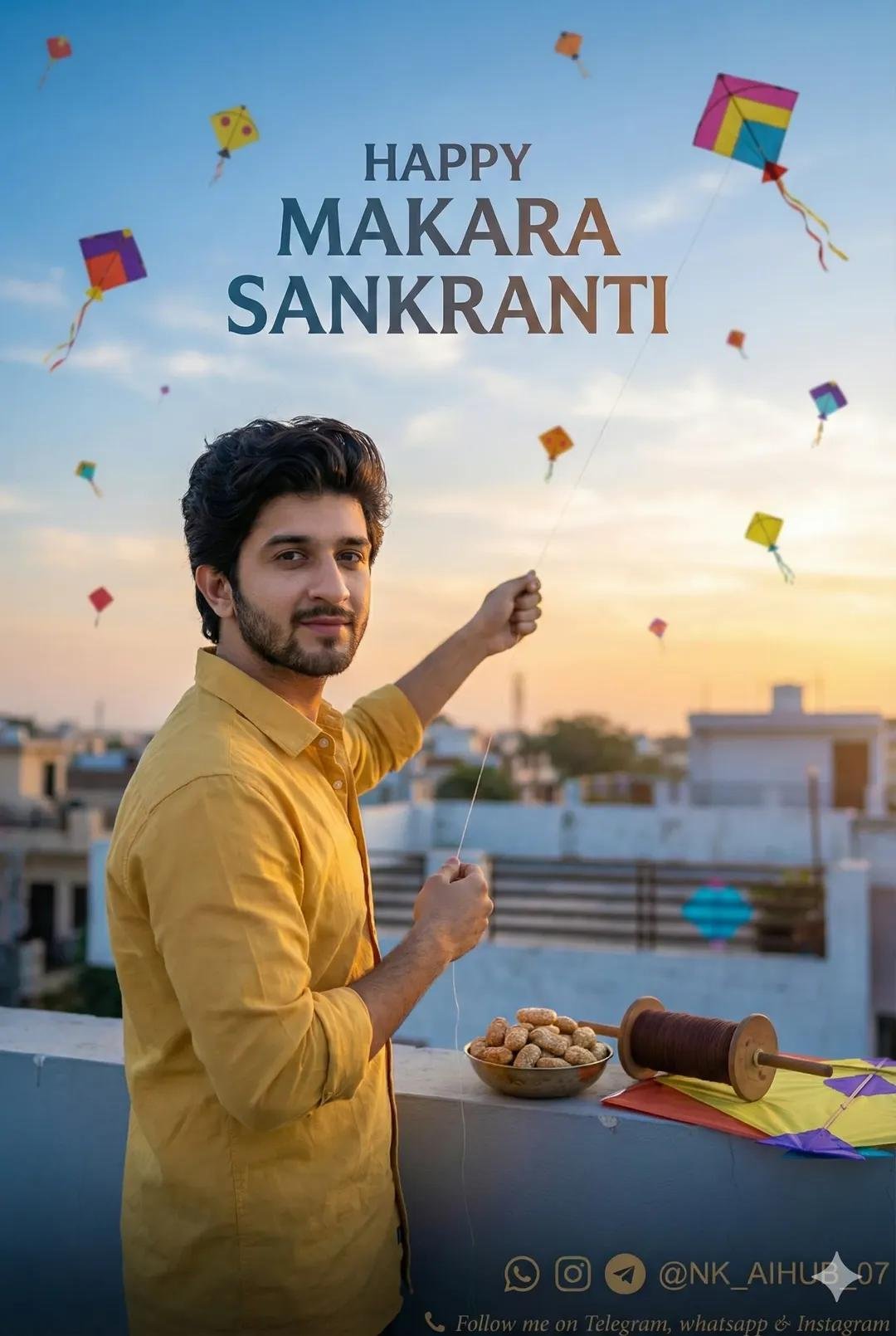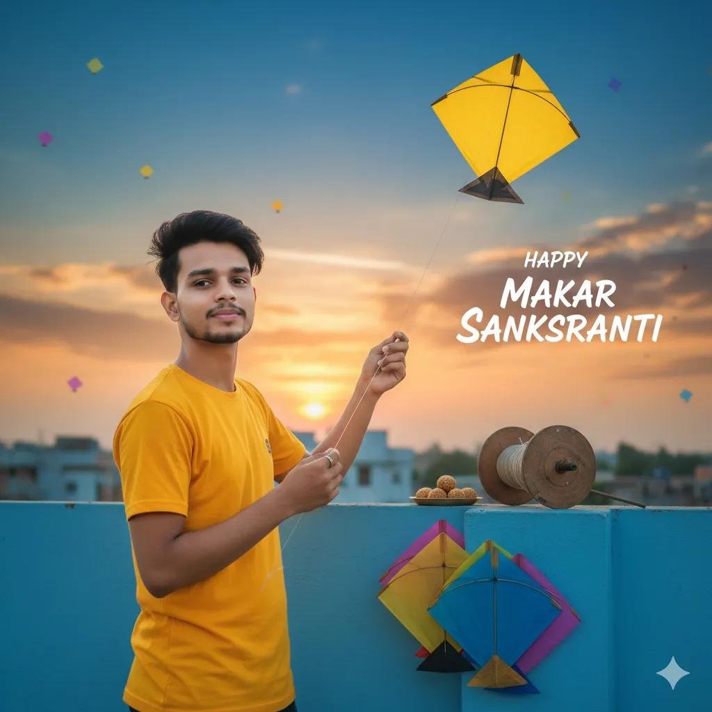 Use the uploaded photo as an accurate reference for the face. Create a very realistic image of a young 25 Indian boy standing on a rooftop. The rooftop wall is neatly painted. He is flying a kite, holding the kite string in his hand, And yellow sirt with. He is looking directly at the camera with a slight smile. Next to him, on the painted wall, place traditional Makar Sankranti items such as tilkut, a kite string reel, and kites. In the blue and sunset sky, display. Text happy makarskranti