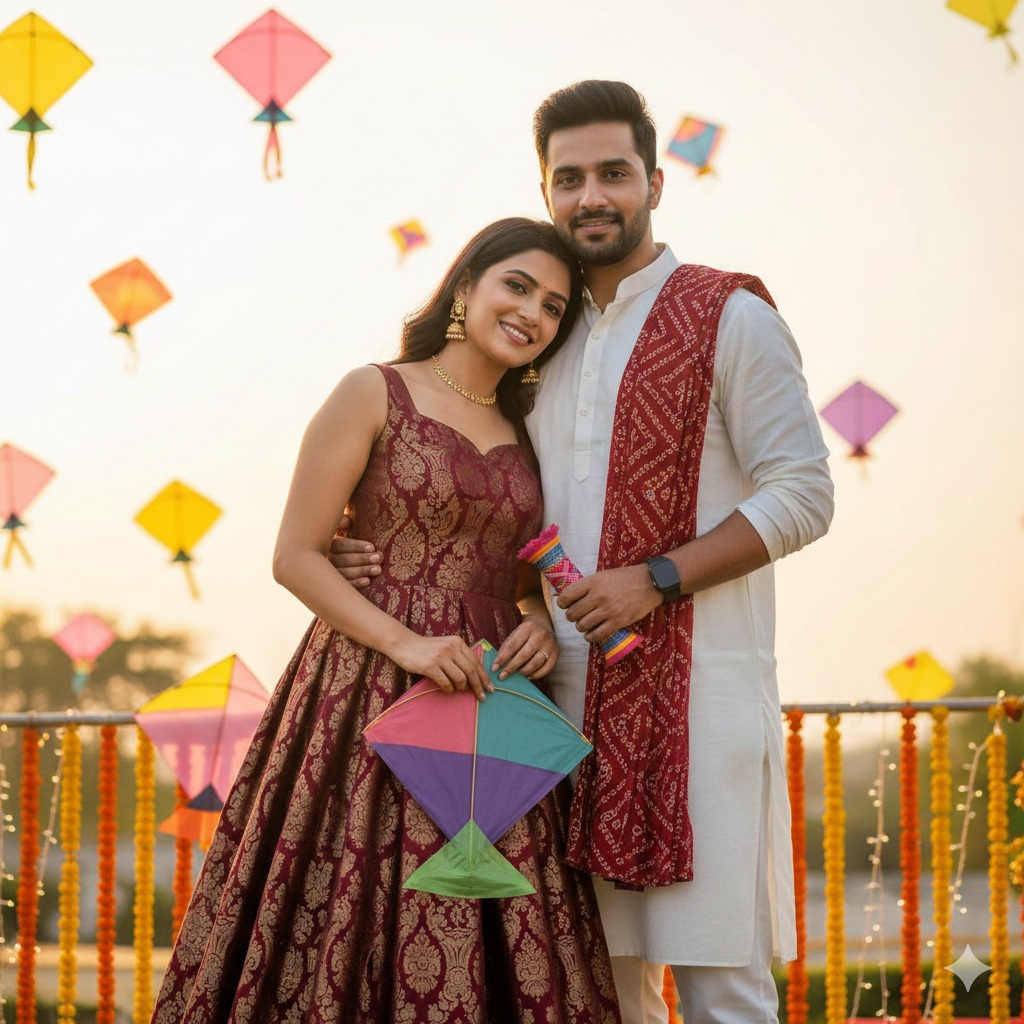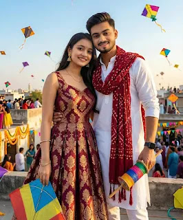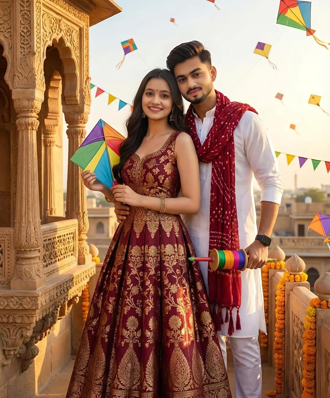 Ultra-realistic 8K Makear Sankranti coluple scenewith EXACT faces from uploaded images. The couple stands close together,facing the camera. The woman leans slightly into her boyfriend’s chest,both smiling warmly. She wears an Indo-Western fusion gown / maxi dress made of rich Banarasi brocade or jacquard silk,deep maroon with golden floral and paisleymotifs,sleeveless sweetheart neckline,fitted bodice,and flared box-pleated skirt. She accessorizes with golden drop earrings and a delicategold chain,holding a colorful kite. The boyfriend stands behind heroone arm gently around her waist,the other holding a colorful firki. He Wears awhite kurta-pajama with deep Ted bandhami dupatta and a black smartwatch.。 Both look directly at the camera with soft,romantic expressions. Background filled with flying kites,golden sunlight,and festive decorations – joyful,vibrant,and perfect for Makar Sankranti.
