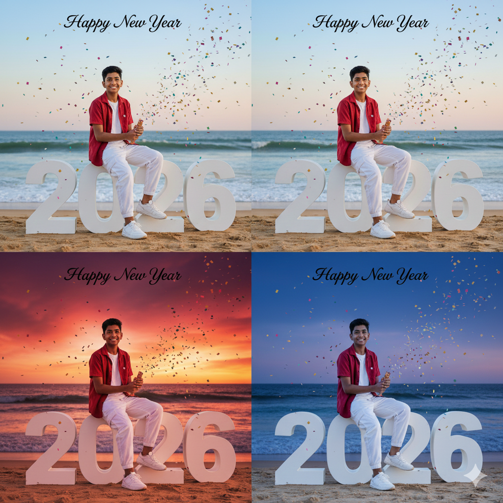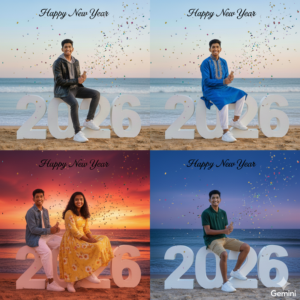 :-A realistic, high-quality full body photo of a handsome young Indian boy sitting casually on large, white 3D numbers ‘2026’ placed on a sandy beach. The boy is smiling and looking at the camera, wearing a red open shirt over a white t-shirt, white cargo pants, and white sneakers. He is holding a party popper in his hand. Colorful confetti is falling all around. The background catures a beautiful bokon green with gradient Heal and pink and soft ocean waves. The text Happy New Year is write.rasel