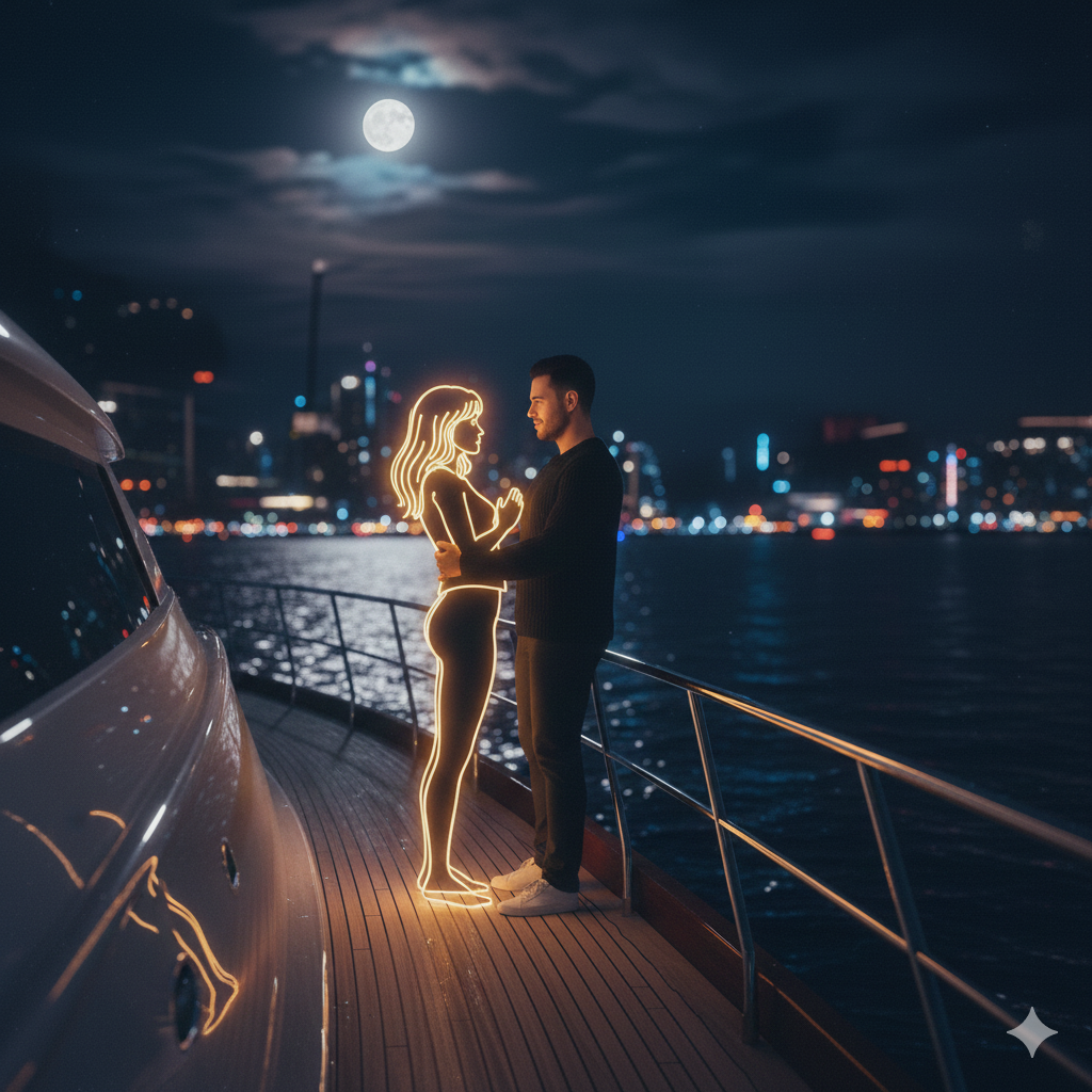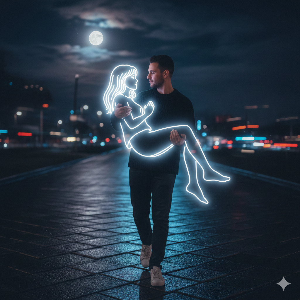 Is editing style mein photos ke andar glowing light strokes aur vibrant colors (jaise electric pink, deep blue, aur neon purple) ka use kiya jata hai. Jab in luminous effects ko kisi couple photo mein add kiya jata hai, toh yeh ek dreamy aur cinematic atmosphere create karta hai. Yeh na sirf aapke rishte ki warmth ko highlight karta hai, balki aapki photo ko ek modern art ka roop bhi deta hai jo scroll karte waqt har kisi ka dhyan khinch leti ha