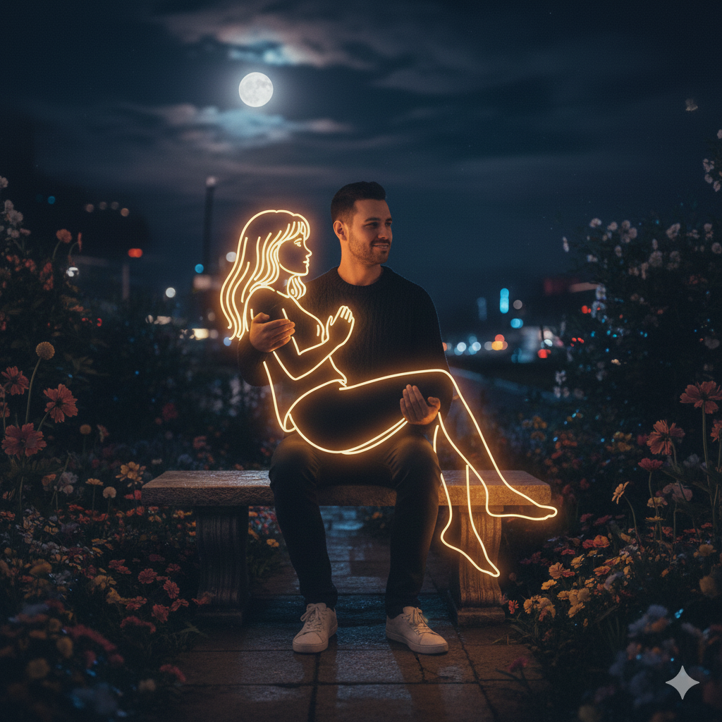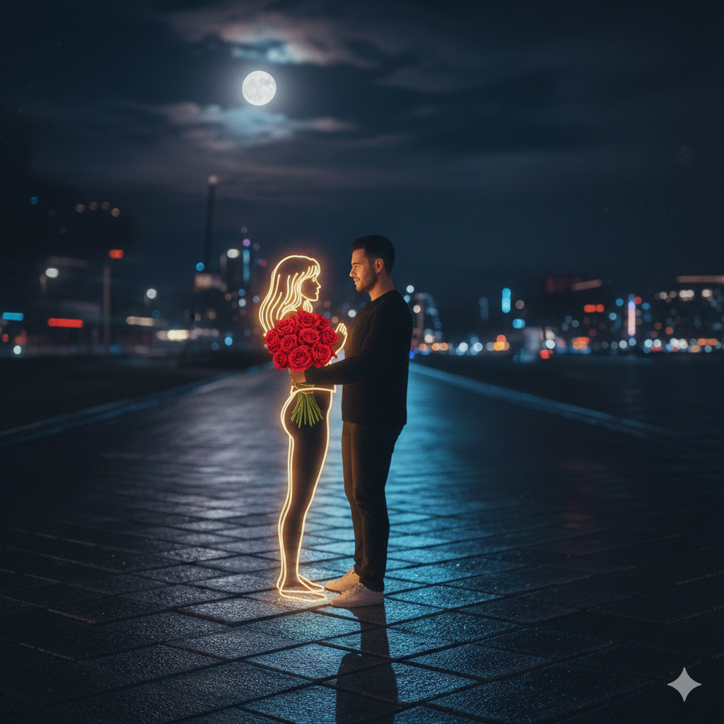 wearing dark casual clothes and white sneakers. Beside him appears a Golden glowing neon-style illustration of a girl holding a bouquet of bright red roses. The neon girl emits a soft white light,