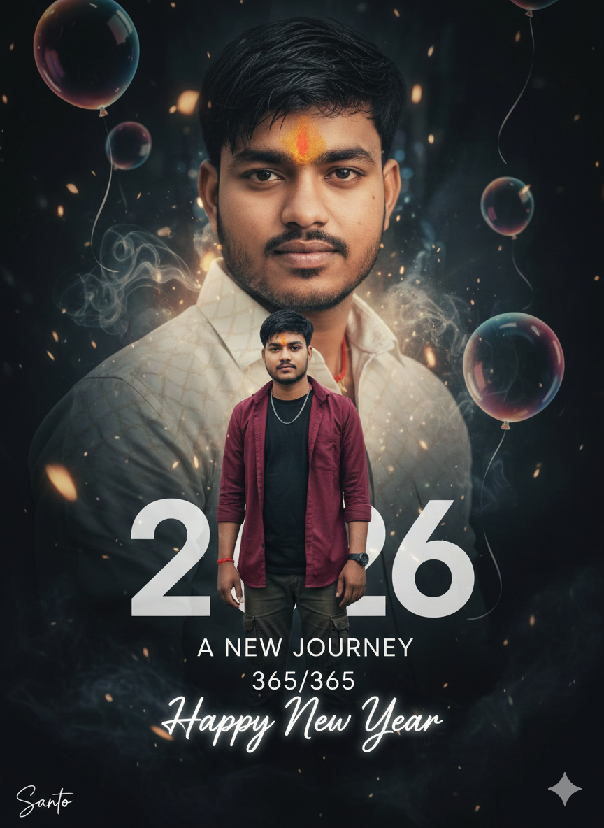 Uploaded man wearing a open marun shirt with black t shirt and cargo. The composition is double exposure style: a large, dominant portrait of the man in the background, with a smaller, full body version of him layered in the foreground. Dominant text in a modern, bold font “2026” with the subtitle “A NEW JOURNEY” and “365/365”. At the bottom, stylized, glowing cursive text says “Tabasam Kathia”. Baground dark and lighting, flowing baluns, smoke behind his. A small Santo signature in left corner.