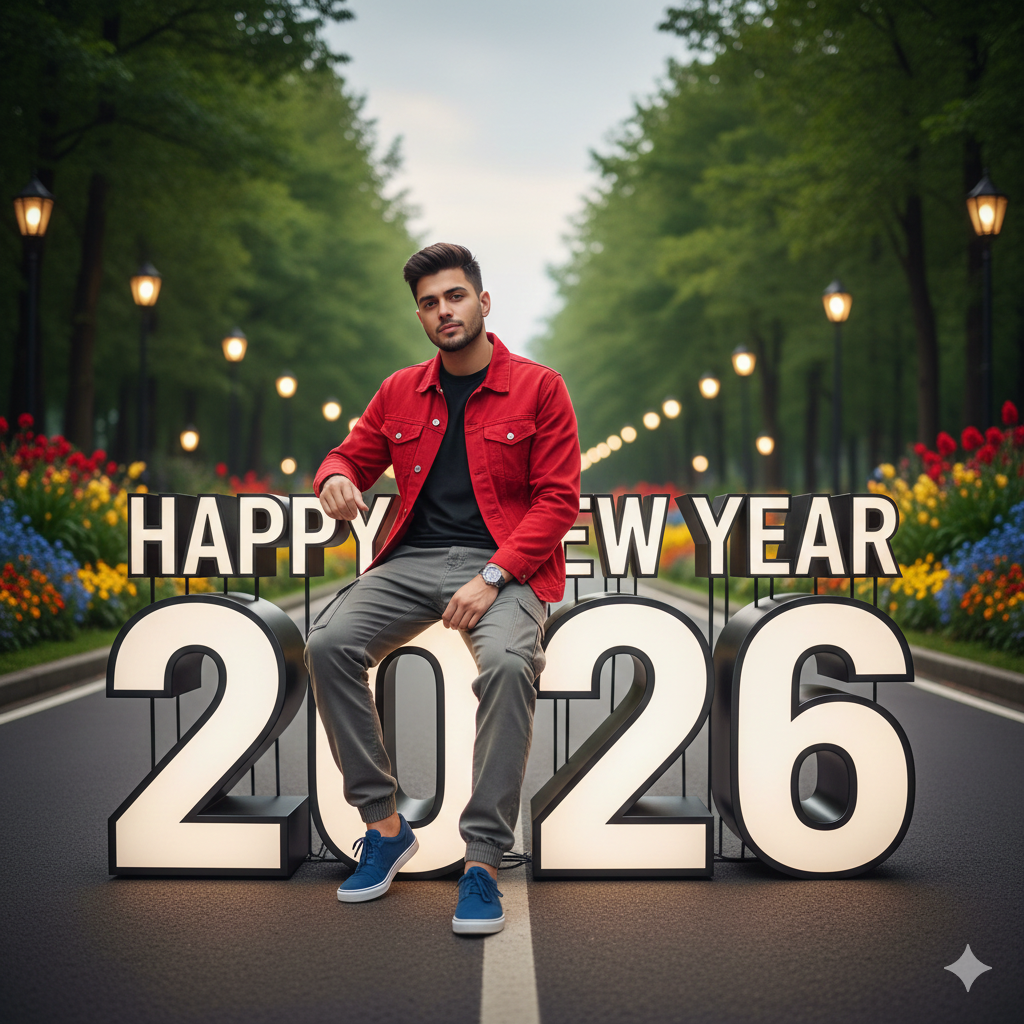 A young stylish man sitting confidently on large “Happy New Year 2026″2025 goodbye numbers placed on a road in a beautiful park. The numbers have a futuristic black outline. He is wearing a black shirt, red denim jacket, grey cargo, and blue sneakers. The background shows green trees, colorful flowers, and a soft lights. The atmosphere feels modern: cinematic, and positive -symbolizing a fresh new year and ultra realistic, depth of field, perfect lighting.