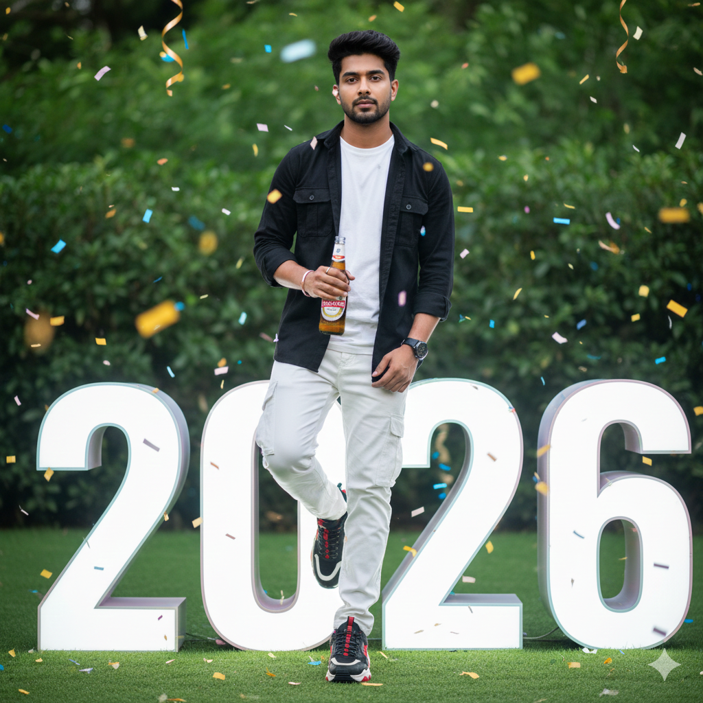 A realistic. high-quality full body photo of a handsome young Indian boy stand poss lag cross casually on large, white 3D Colour Mix numbers ‘2026 side on body arm touching .on a background green and blur. The bou is and looking at the camera. Black shirt white ti shirt .white cargo pants, and Black Red Chif big soul shoes: te is holding a bear botle king fisher in his hand. Air Sperry Celebration. New year background is Clearly.