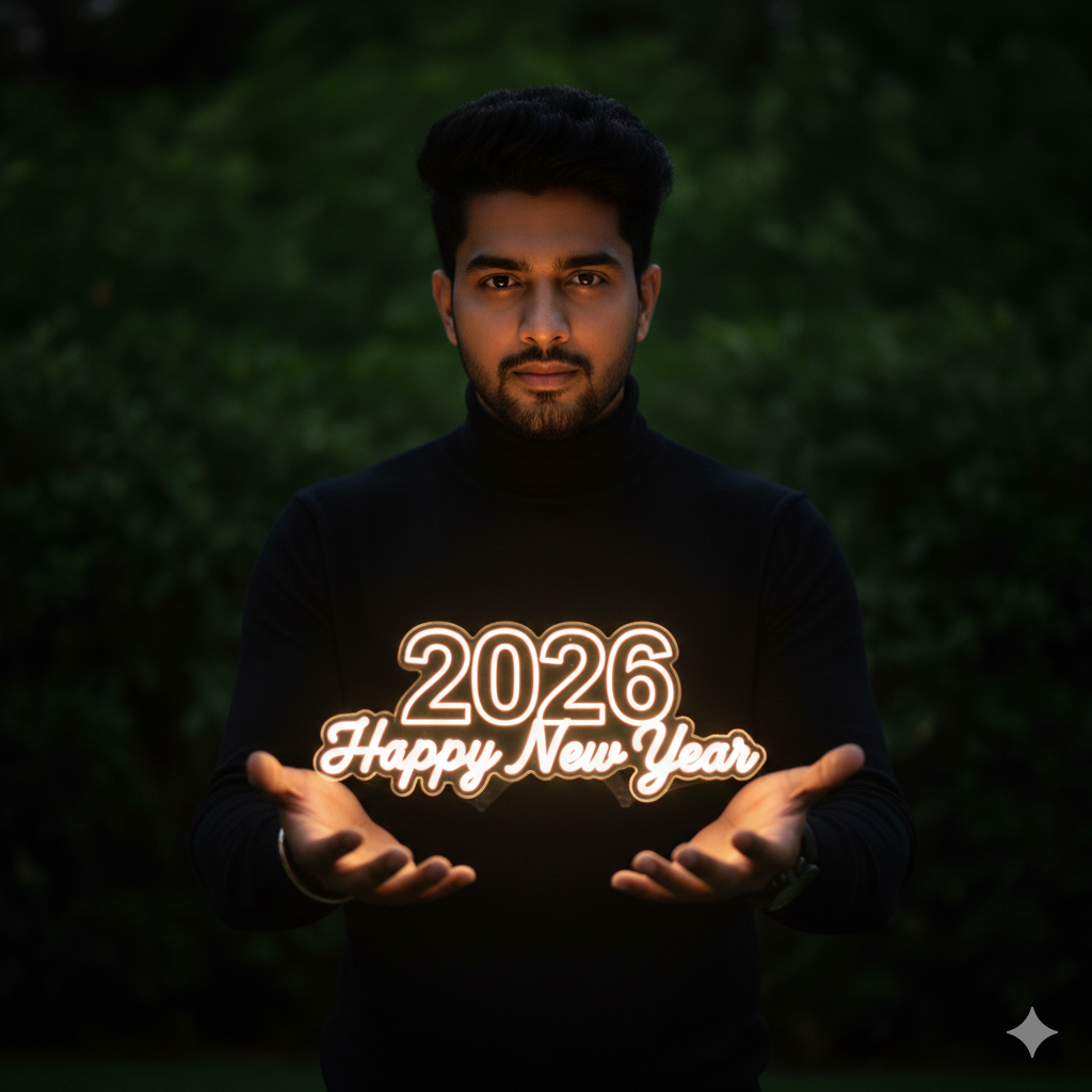 “A young man with your face, wearing a dark turtleneck, holding glowing text that reads ‘2026’ ‘ Happy New year’ in his hands. The scene is dark, with the glowing text illuminating his face and hands. The style is a realistic photograph with dramatic, low-key lighting.”