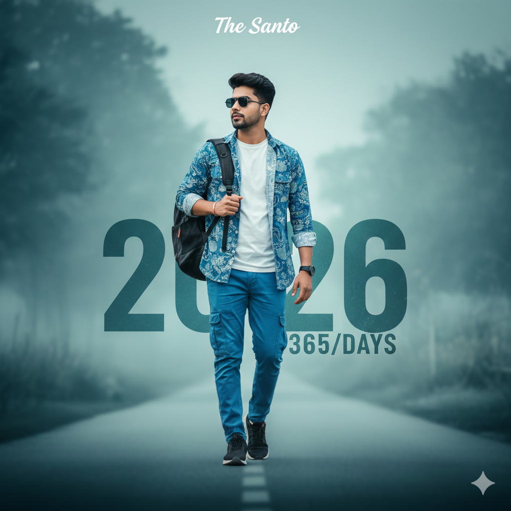 Uploaded man wearing sunglasses, white and blue batan shirt, blue cargo and left hand black backpack walking confidently across a soft, blurred foreground. The background misty ethereal landscape, dominated by muted teal, blue and light gray tones subject large style text overlay reads “2026” bold, slightly distressed teal font. Smaller text below it says “365/DAYS” and “The Santo” in top. Cinematic, highly-detailed, soft lighting, style, new year.Camera angle is left side